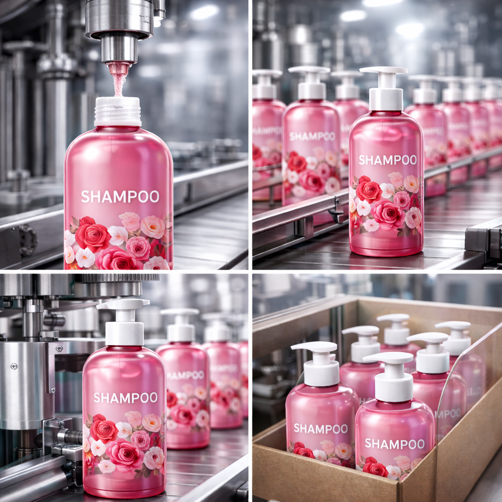 - پر کردن و بستهبندی : (Filling & Packaging) شامپوی آماده شده به خطوط پرکن منتقل میشود و در بطریهای از پیش آماده شده پر میشود. سپس دربگذاری، برچسبزنی، و بستهبندی نهایی در جعبهها انجام میگیرد.